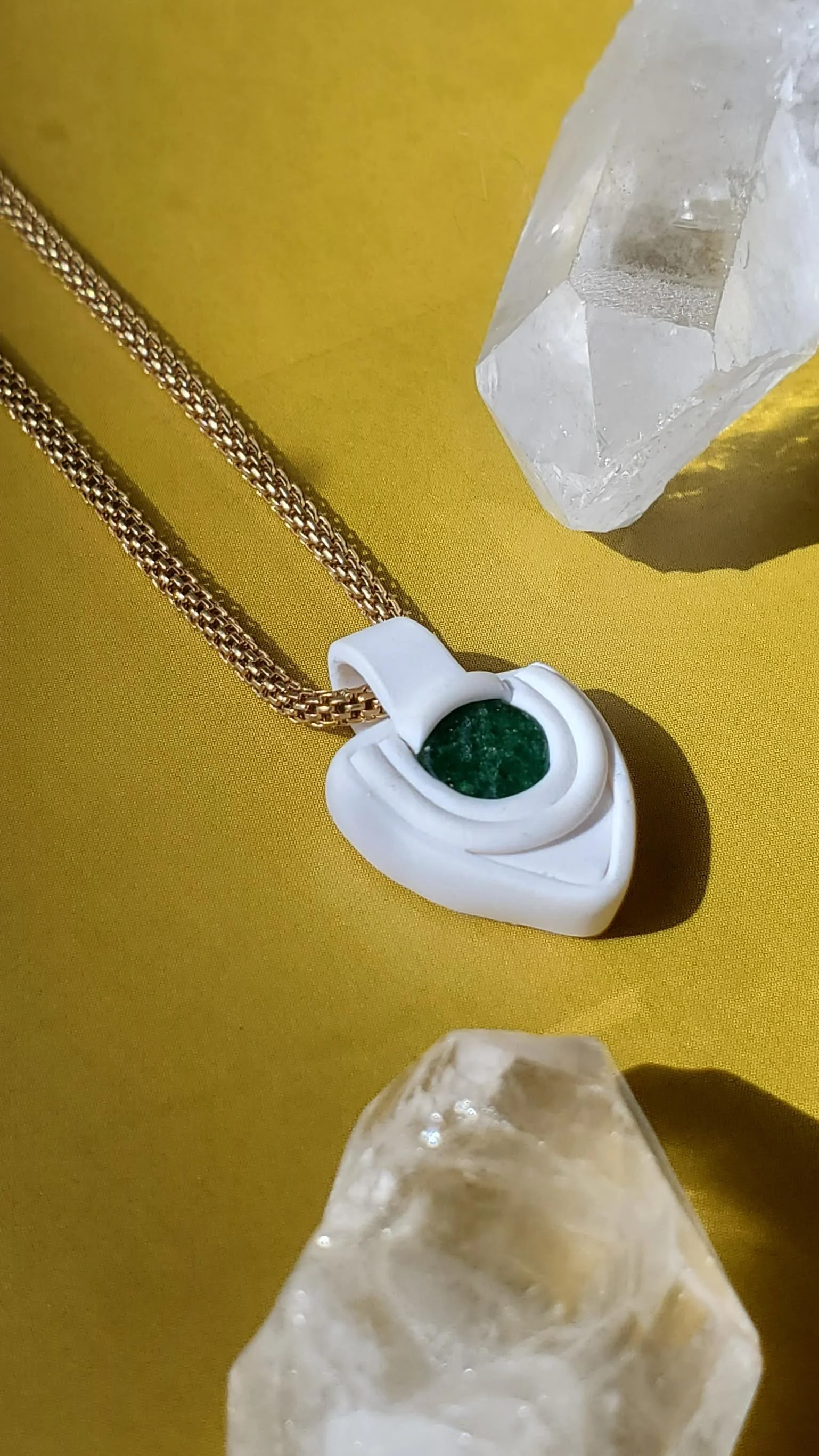 Sculpted white polymer clay (matte, no finish) wth natural green onyx gemstone on 18k gold plated stainless steel mesh chain